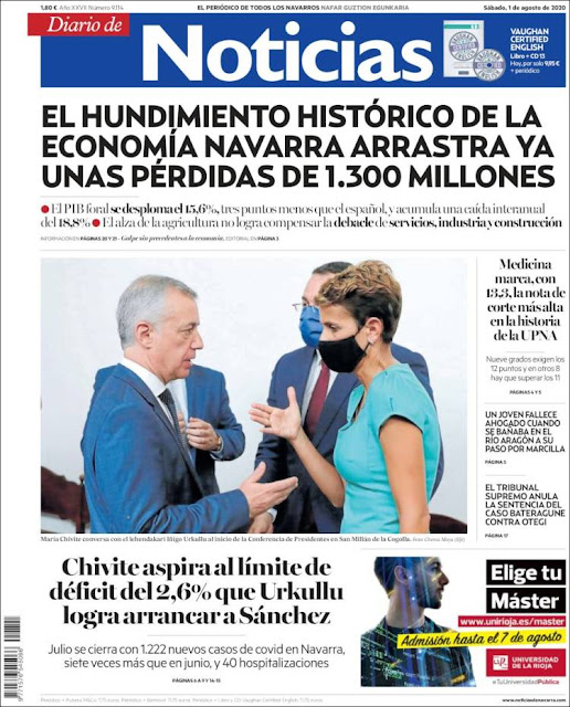 Desplome económico y País Vasco con el "ande yo caliente...". Portadas del sábado, 1 de agosto 2020