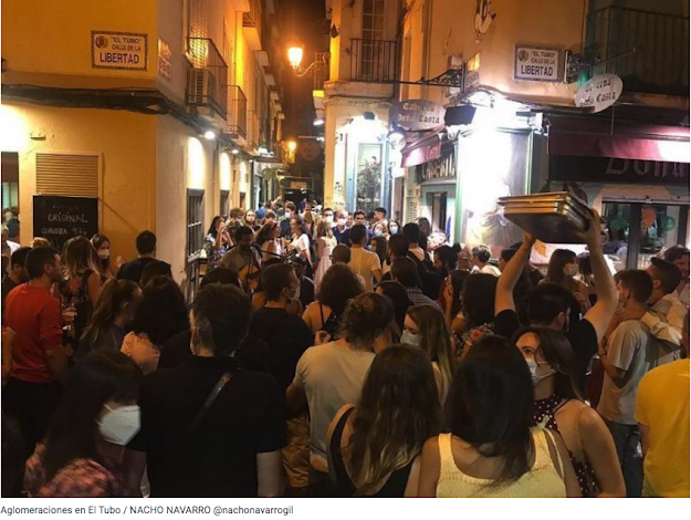 Sin mascarilla no pocos, sin distancia de seguridad un pelotón de gentes, un tropel fumando y hasta con música en plena calle para mayor descaro... Es el ambiente que se ha vivido reiteradamente, durante horas, en muchos espacios de la zona llamada de El Tubo de Zaragoza, calles del Tubo, Estebanes, Libertad..., este pasado fin de semana. Las imágenes se han hecho virales a través de Internet y preocupan ahora muy seriamente...