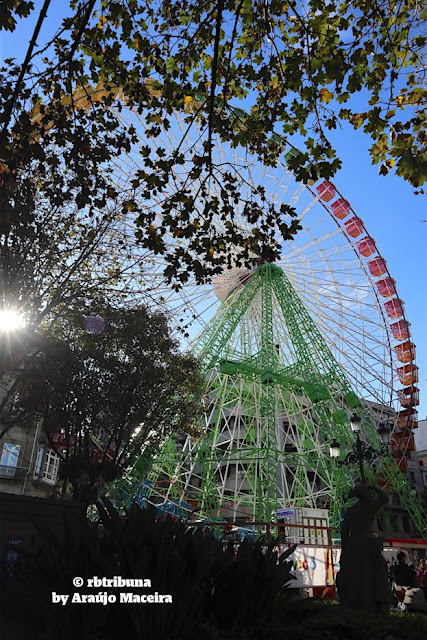 VIGO, la ciudad más grande de la Eurorregión Galicia-Norte de Portugal. Ya es Navidad. Porque así lo decretó su alcalde, el populista-socialista Abel Caballero. La verdad : ahora muchas ciudades copian lo inventado hace años por Caballero y hacen Navidad antes de tiempo. Ya es Navidad en Vigo. Algo tan céntrico como su histórica Alameda aparece atrancado por las atracciones de Feria, la noria, los caballitos, los cachivaches diversos y... las casetas donde de todo se vende, especialmente de las cosas de comer y beber. No solo son las luces que de noche transforman la Ciudad -este año más- en un espectáculo. De día, los entretenimientos no faltan para niños y mayores. Dimos un paseo por la zona. Y comenzamos retratando la gigantesca noria y sus aledaños... y los visitantes que no faltan.