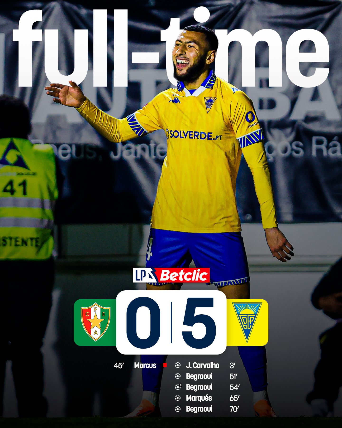 Ainda antes do intervalo, nova contrariedade para os tricolores, com a expulsão de Abraham Marcus. Mas as más notícias para o Estrela Amadora não ficaram por aqui. Logo após o reatamento, Begraoui, em dose dupla e em apenas três minutos, dilatou a vantagem canarinha, concluindo uma grande jogada coletiva e, pouco depois, na conversão de um castigo máximo.